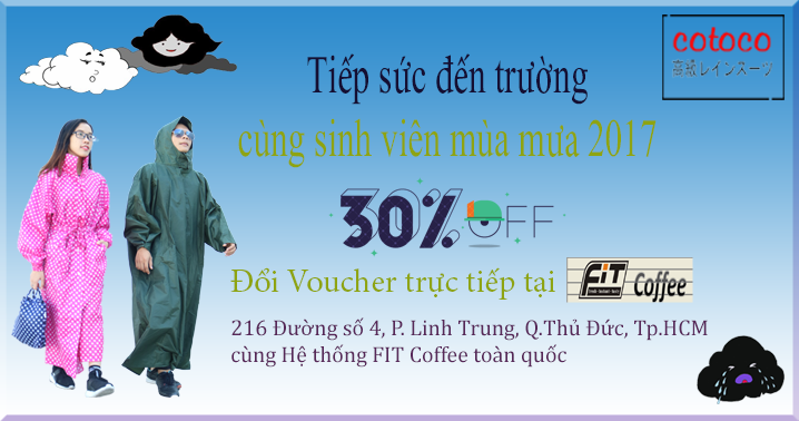 - Mỗi sinh viên được tặng Voucher giảm giá 30% cho một lần mua sản phẩm áo mưa COTOCO